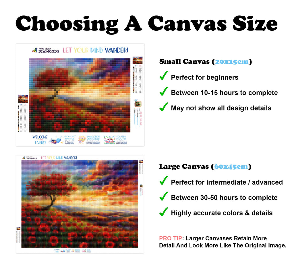 Large canvases show tiny details and all lettering, but may take up to 50+ hours to complete.