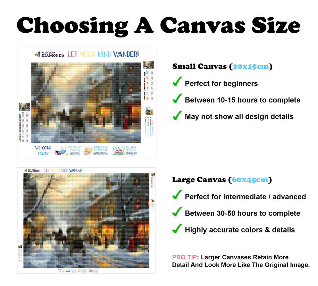 Escape into a world of vibrant colors and creative tranquility with the ‘Victorian Winter Street Scene’ Diamond Painting Kit. This exclusive full-drill design by artist Caleb Smith is available only at Paint With Diamonds. Let your mind unwind as you piece together shimmering diamonds to create a beautiful masterpiece.