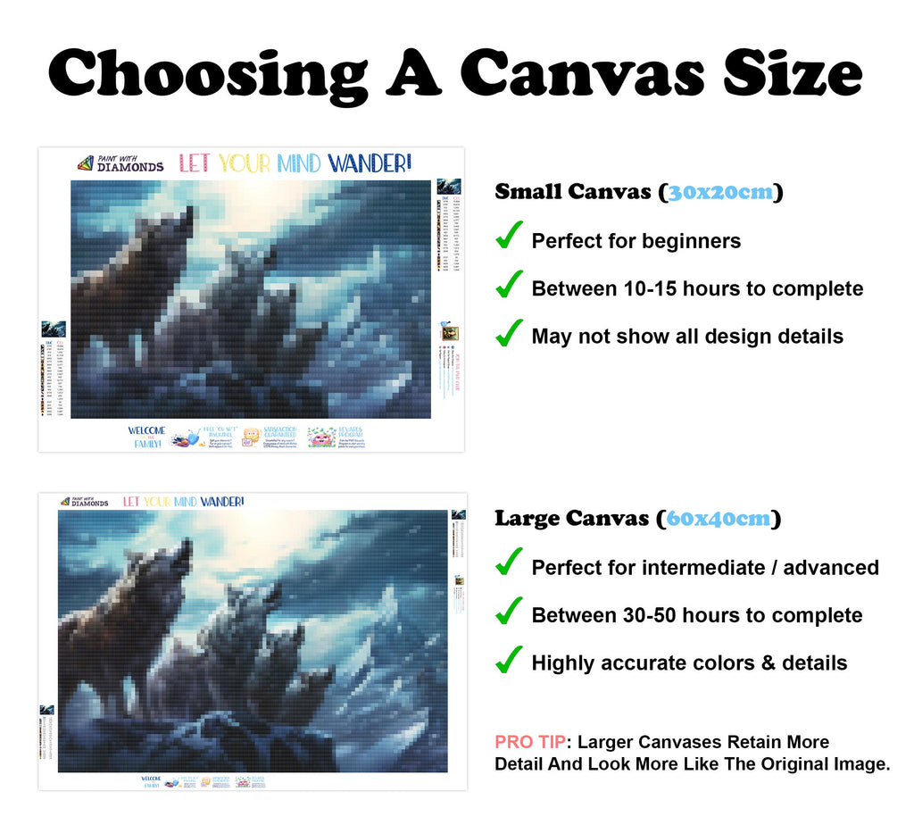 Large canvases show tiny details and all lettering, but may take up to 50+ hours to complete.