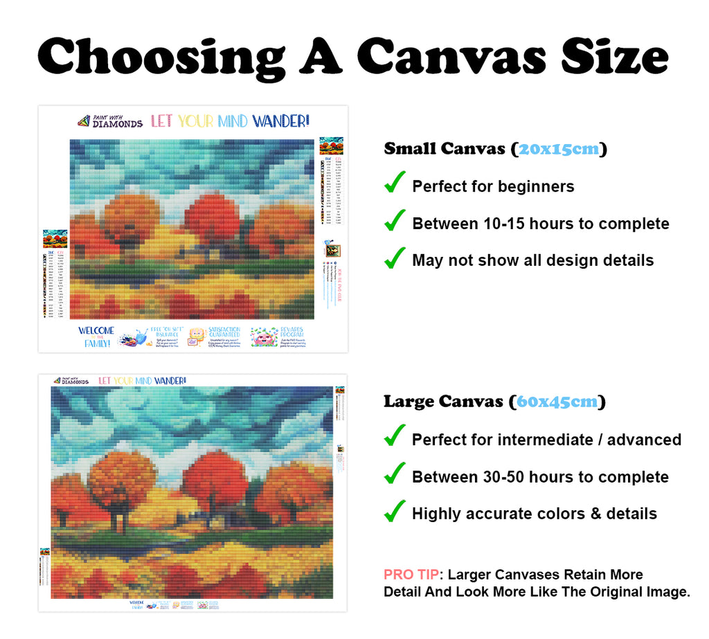 Large canvases show tiny details and all lettering, but may take up to 50+ hours to complete.