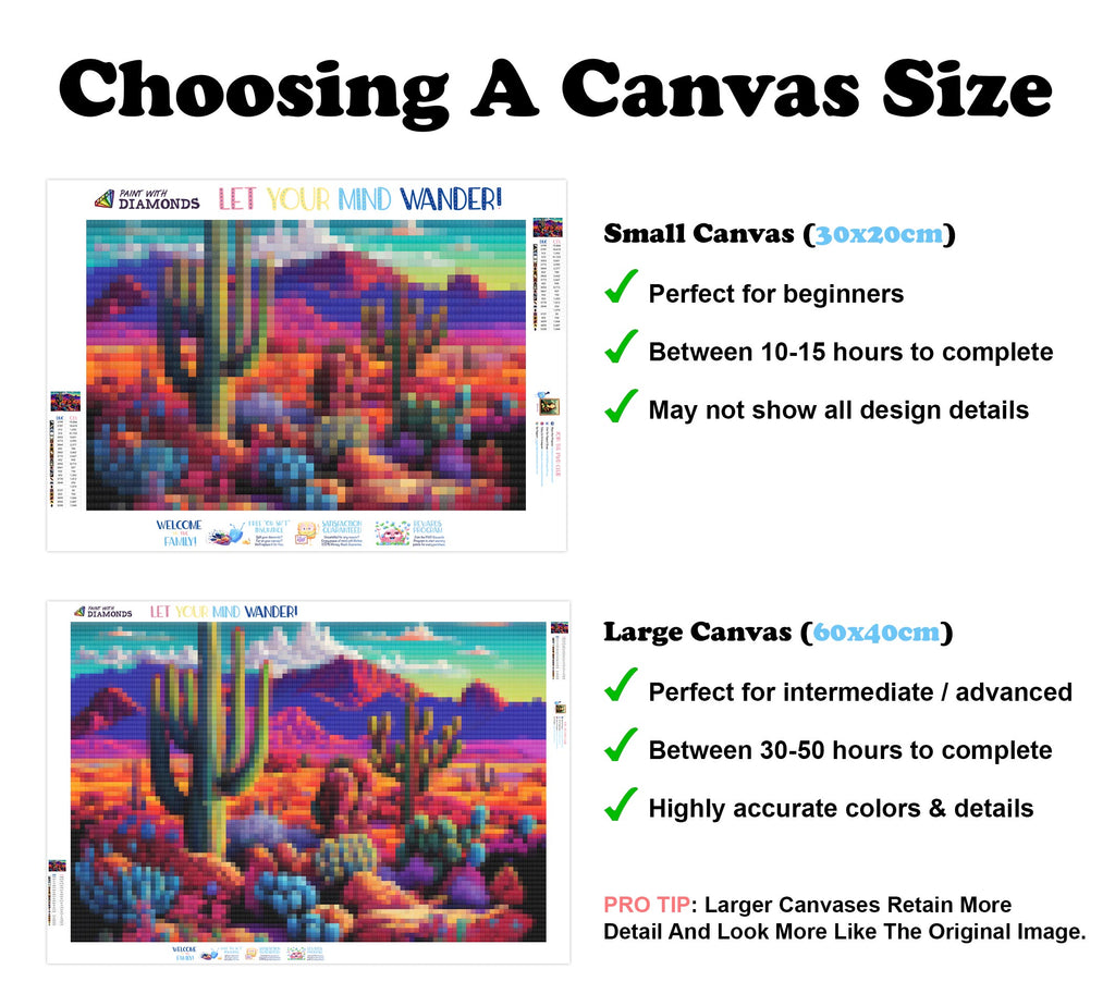 Escape into a world of vibrant colors and creative tranquility with the ‘Cacti Colorful Landscape’ Diamond Painting Kit. This exclusive full-drill design by artist Caleb Smith is available only at Paint With Diamonds. Let your mind unwind as you piece together shimmering diamonds to create a beautiful masterpiece.