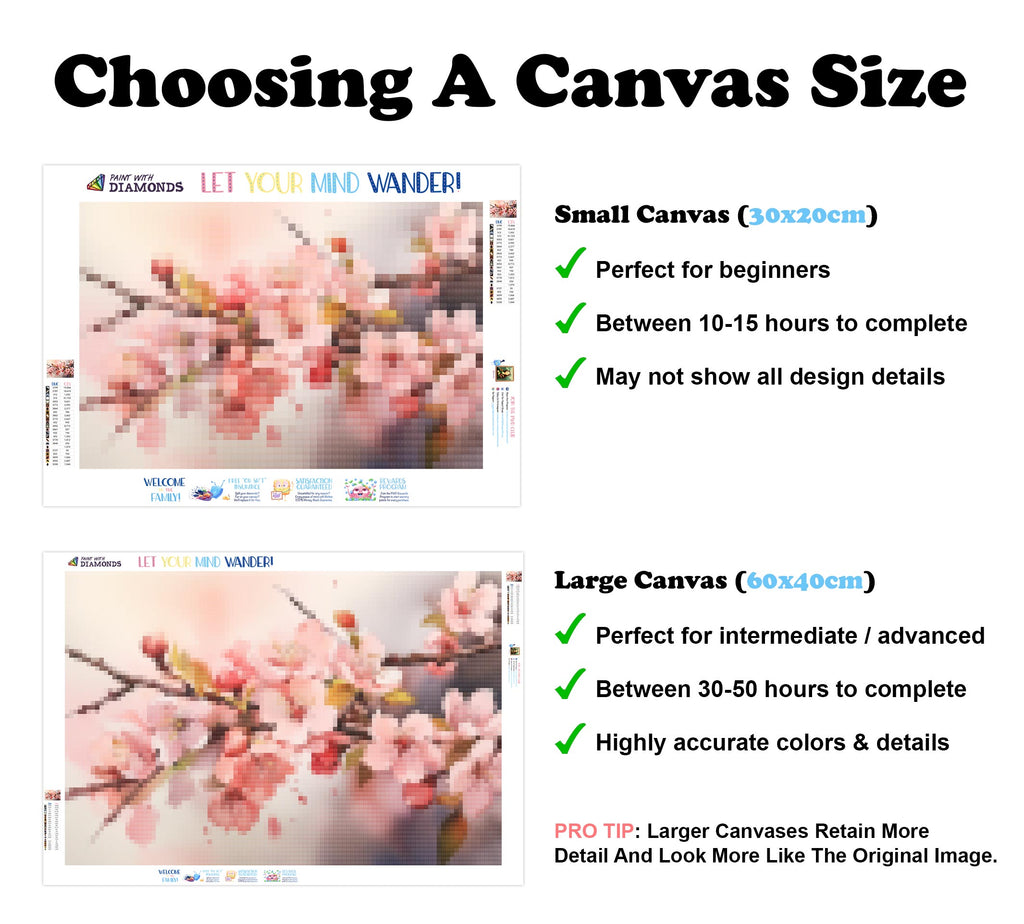 Large canvases show tiny details and all lettering, but may take up to 50+ hours to complete.