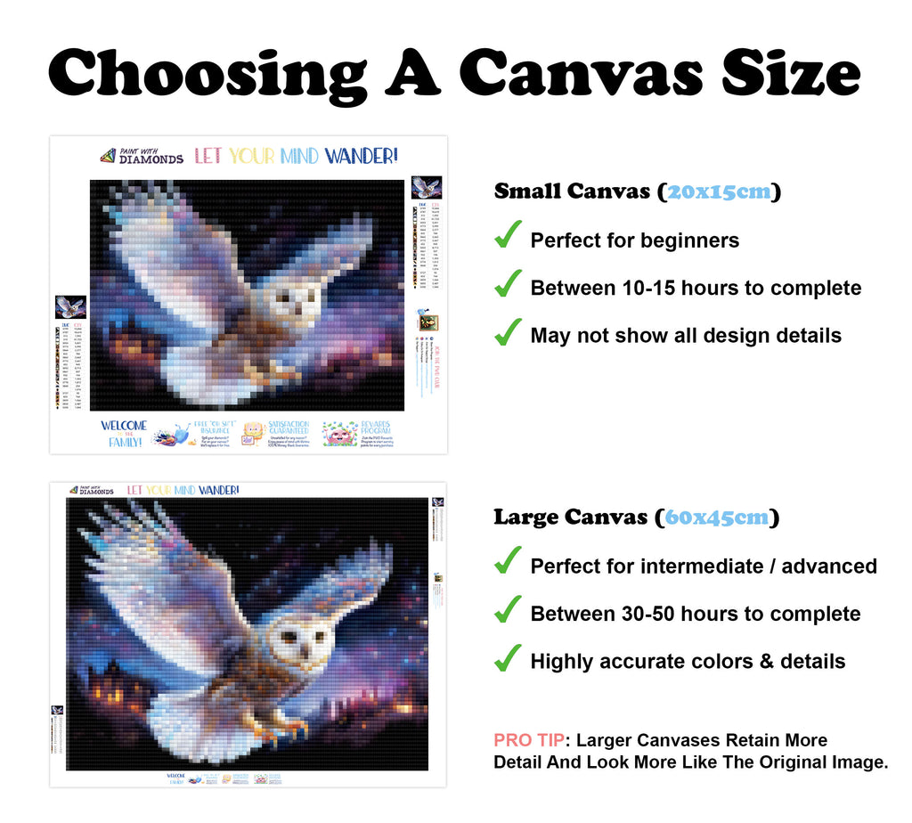 Large canvases show tiny details and all lettering, but may take up to 50+ hours to complete.