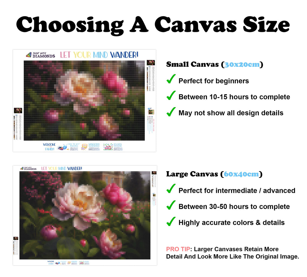 Large canvases show tiny details and all lettering, but may take up to 50+ hours to complete.