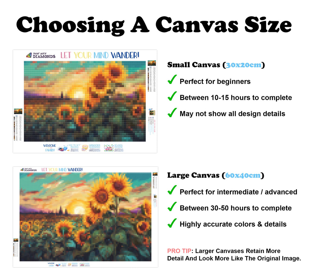 Large canvases show tiny details and all lettering, but may take up to 50+ hours to complete.