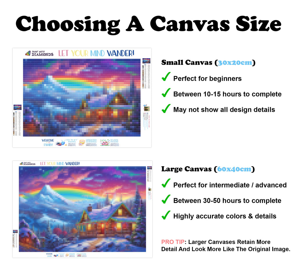 Large canvases show tiny details and all lettering, but may take up to 50+ hours to complete.
