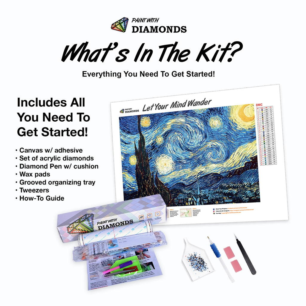 PREMIUM DIAMOND PAINTING KIT: Official Diamond Art kit includes 1x stay-flat adhesive canvas, 1x set of shimmering eco-friendly resin diamonds, and 1x premium toolkit. Diamonds cover the whole canvas.
