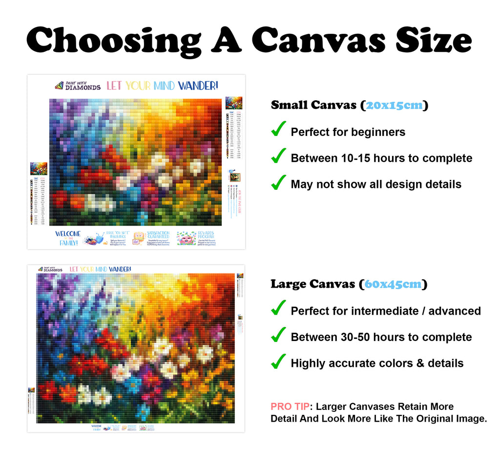 Large canvases show tiny details and all lettering, but may take up to 50+ hours to complete.