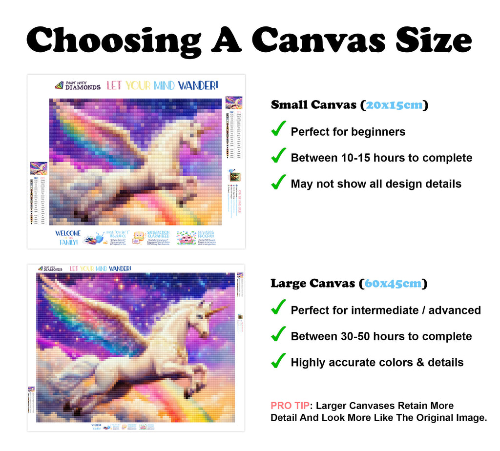 Large canvases show tiny details and all lettering, but may take up to 50+ hours to complete.