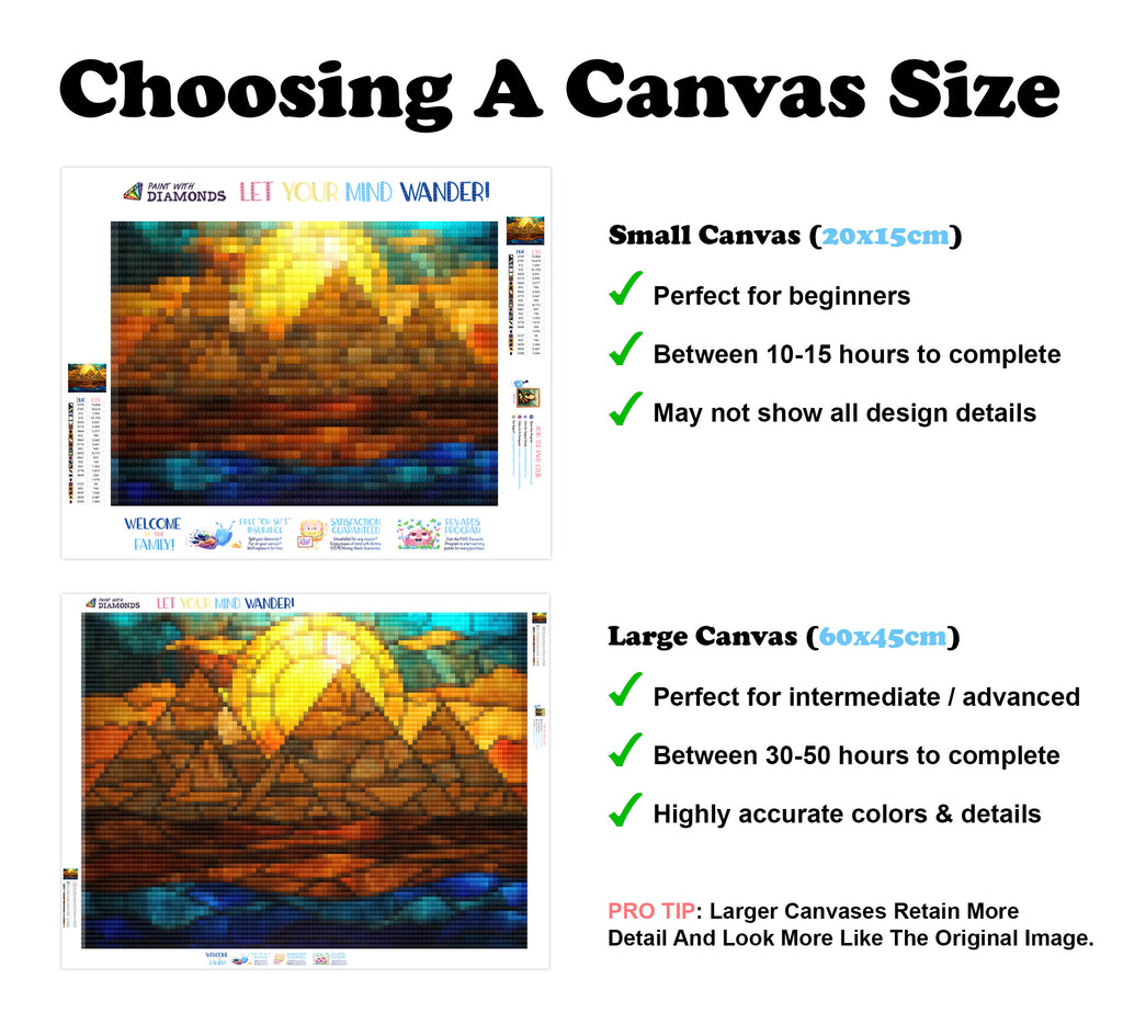 Escape into a world of vibrant colors and creative tranquility with the ‘Pyramids of Giza Stained Glass’ Diamond Painting Kit. This exclusive full-drill design by artist Caleb Smith is available only at Paint With Diamonds. Let your mind unwind as you piece together shimmering diamonds to create a beautiful masterpiece.