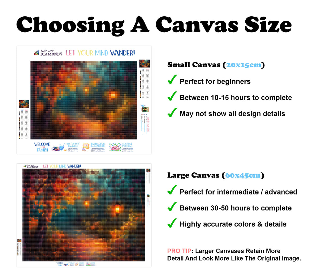 Large canvases show tiny details and all lettering, but may take up to 50+ hours to complete.