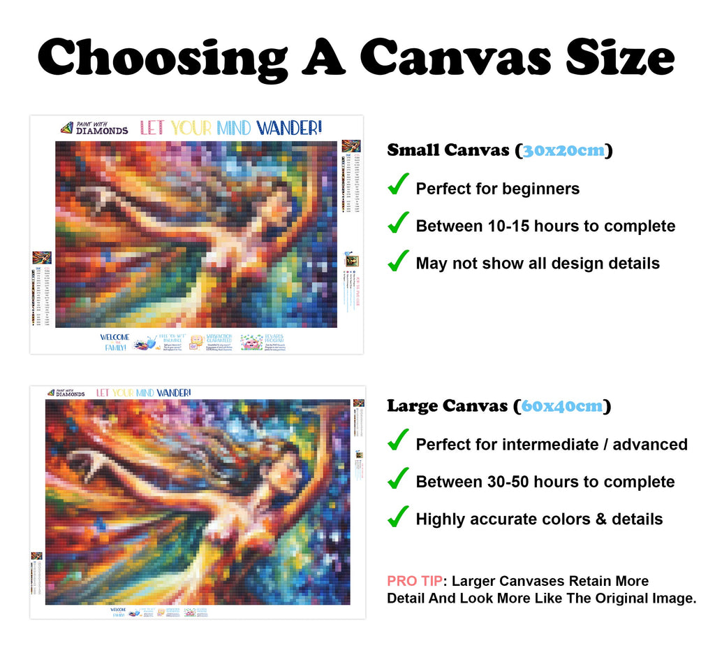 Premium Quality Diamond Painting Kit: Includes a velvety-soft adhesive canvas, eco-friendly shimmering resin diamonds, and a premium toolkit - everything you ned to get started on your next masterpiece.