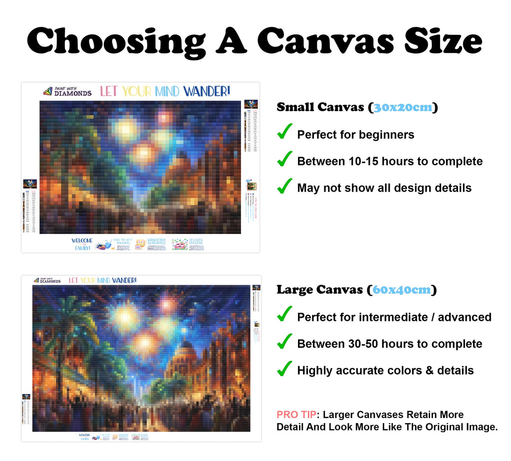 Large canvases show tiny details and all lettering, but may take up to 50+ hours to complete.