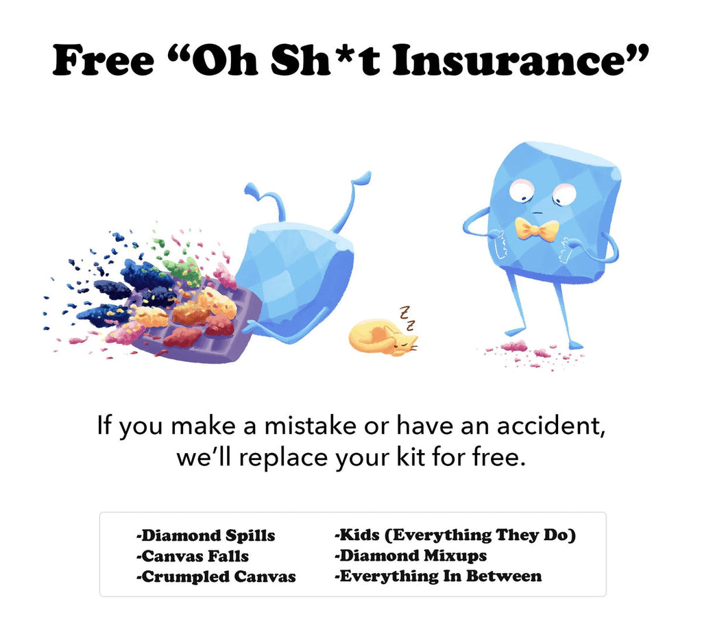 FREE 'OH SH*T' INSURANCE: Sh*t happens. When it does, know that we've got your back! If the cat walks on your canvas, kid turns your diamonds into confetti, whatever happens - we'll replace your canvas or diamonds for FREE.