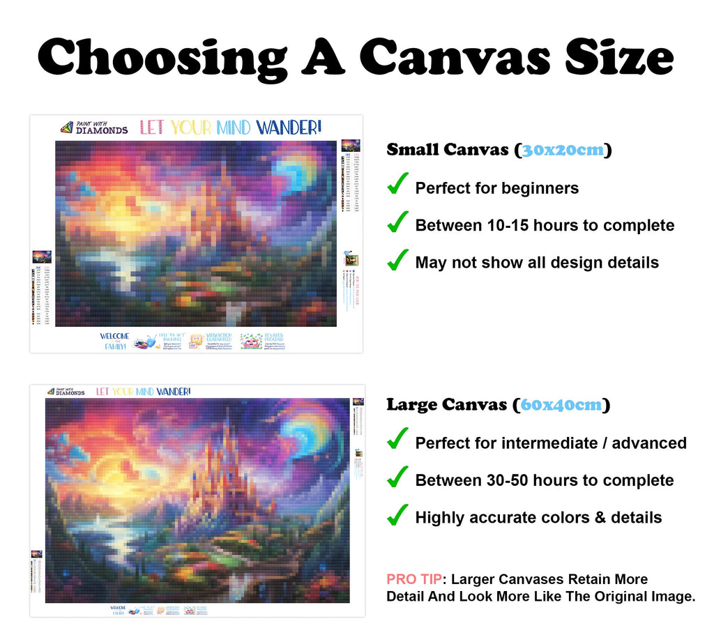 Large canvases show tiny details and all lettering, but may take up to 50+ hours to complete.