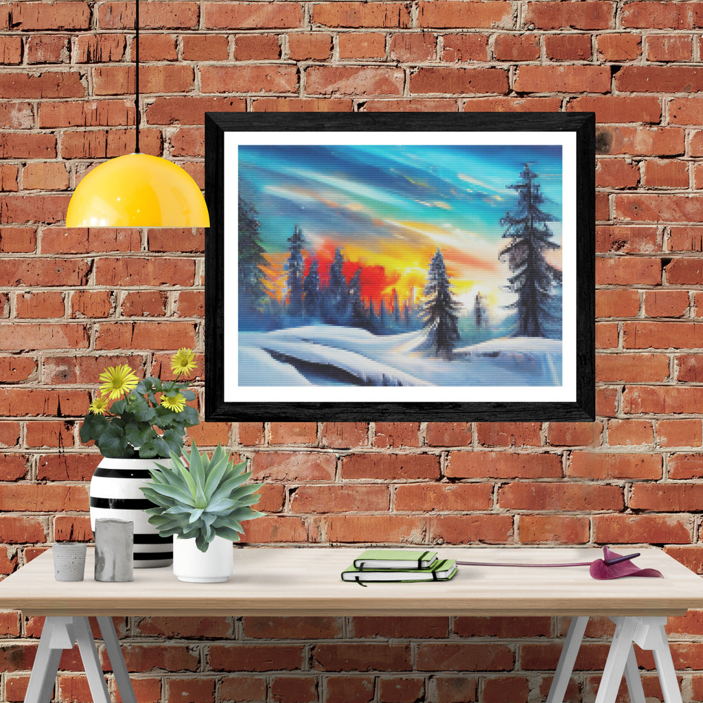 Escape into a world of vibrant colors and creative tranquility with the ‘Sun Sets In Winter’ Diamond Painting Kit. This exclusive full-drill design by artist Caleb Smith is available only at Paint With Diamonds. Let your mind unwind as you piece together shimmering diamonds to create a beautiful masterpiece.