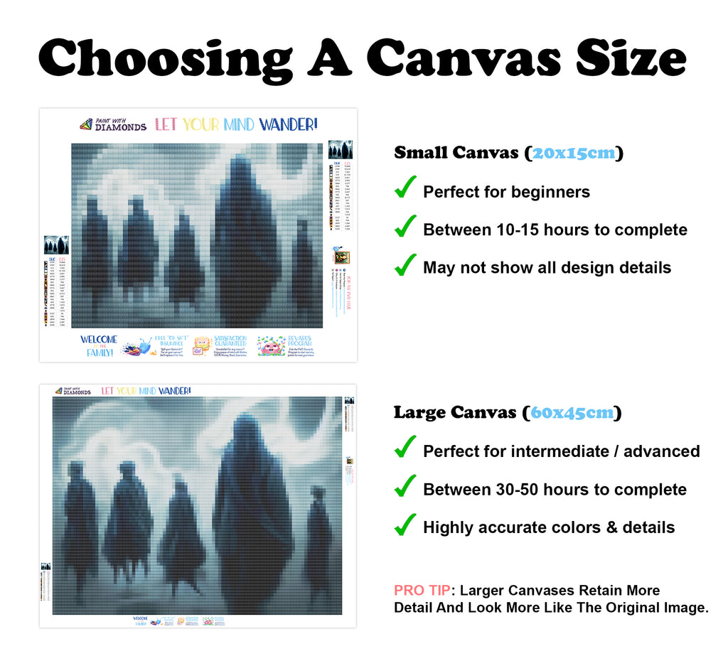 Large canvases show tiny details and all lettering, but may take up to 50+ hours to complete.