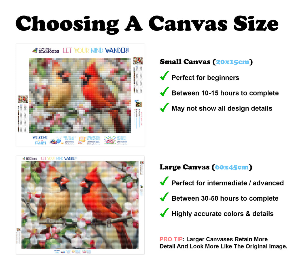 Large canvases show tiny details and all lettering, but may take up to 50+ hours to complete.