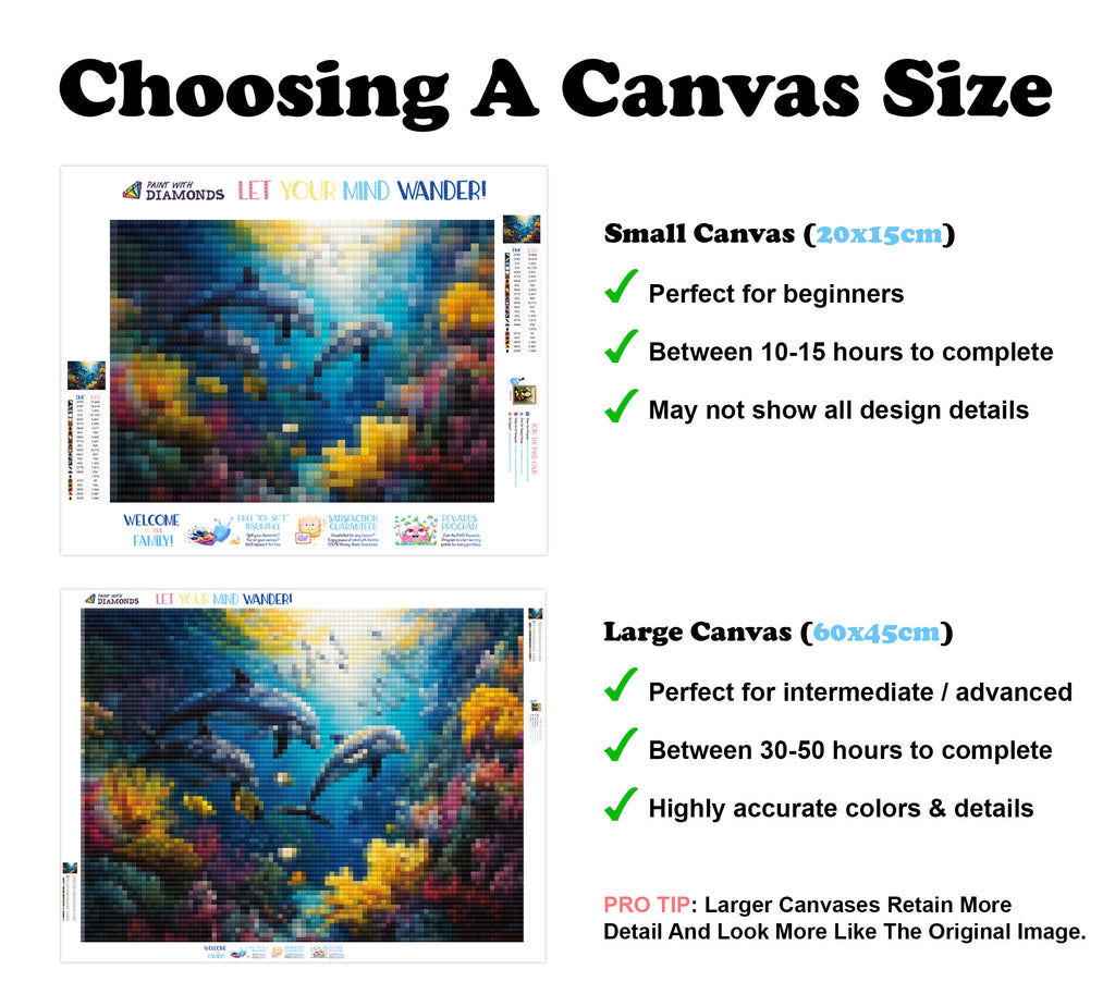 Large canvases show tiny details and all lettering, but may take up to 50+ hours to complete.