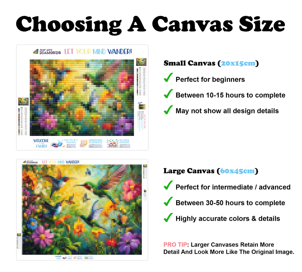 Large canvases show tiny details and all lettering, but may take up to 50+ hours to complete.