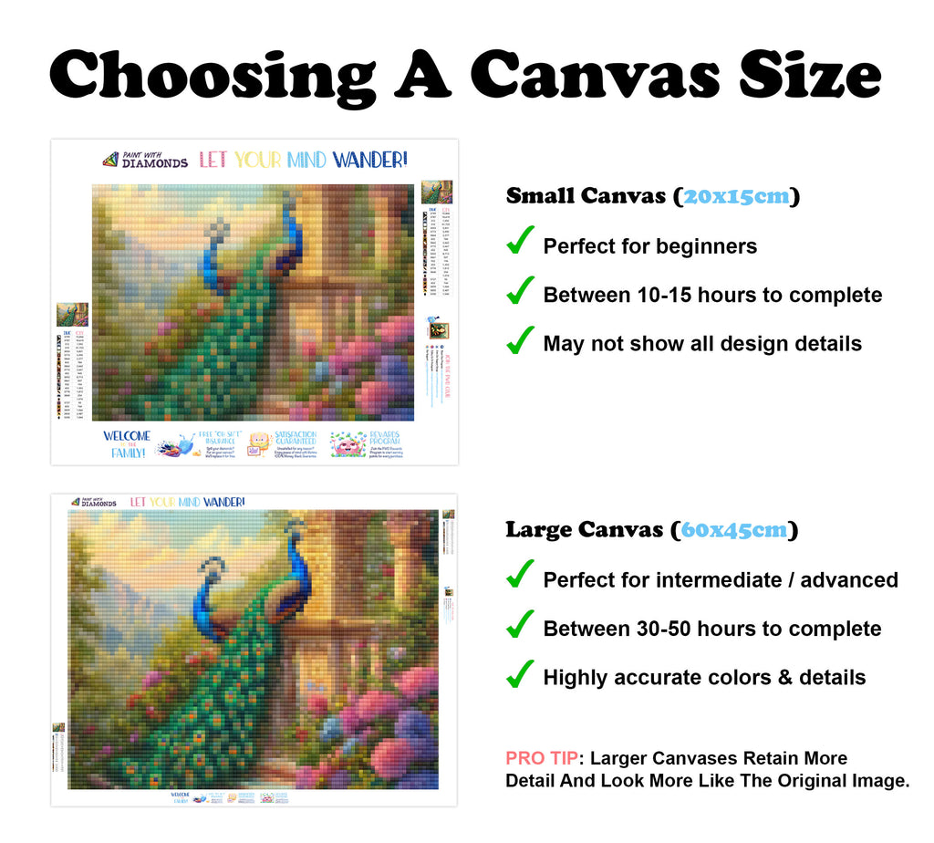 Large canvases show tiny details and all lettering, but may take up to 50+ hours to complete.