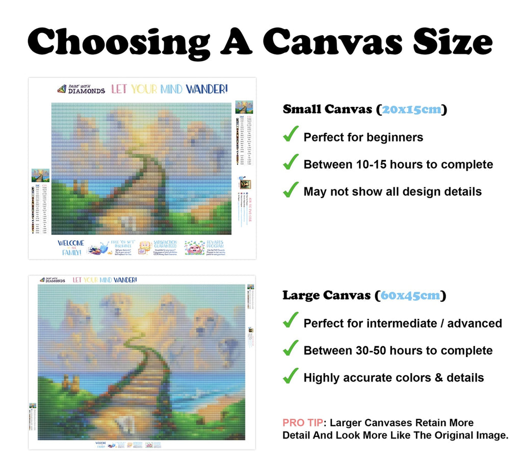 Large canvases show tiny details and all lettering, but may take up to 50+ hours to complete.Medium canvases show significant detail but take between 20-30 hours to complete.