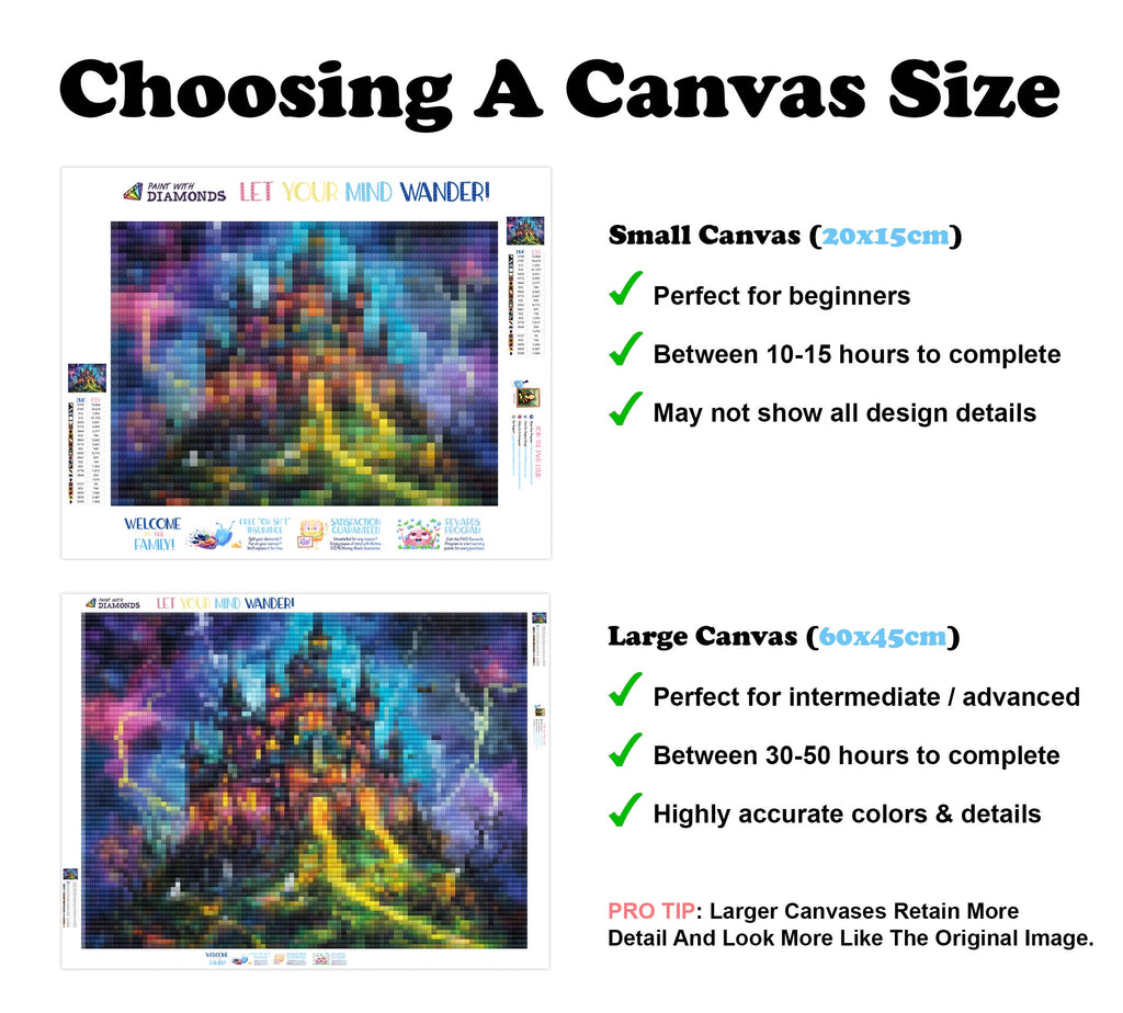 Large canvases show tiny details and all lettering, but may take up to 50+ hours to complete.