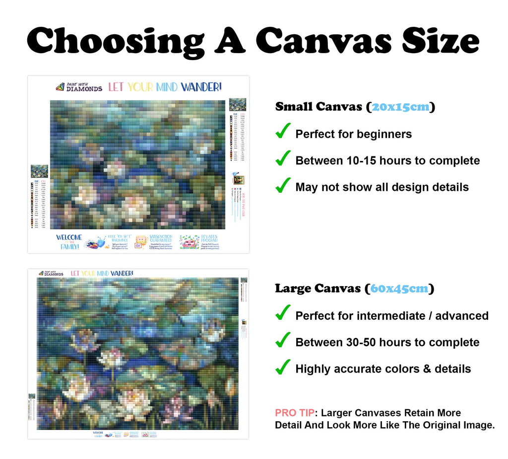 Large canvases show tiny details and all lettering, but may take up to 50+ hours to complete.