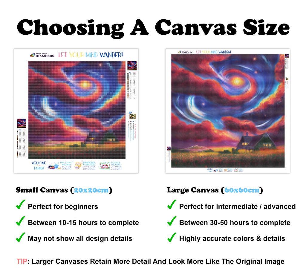 Large canvases show tiny details and all lettering, but may take up to 50+ hours to complete.