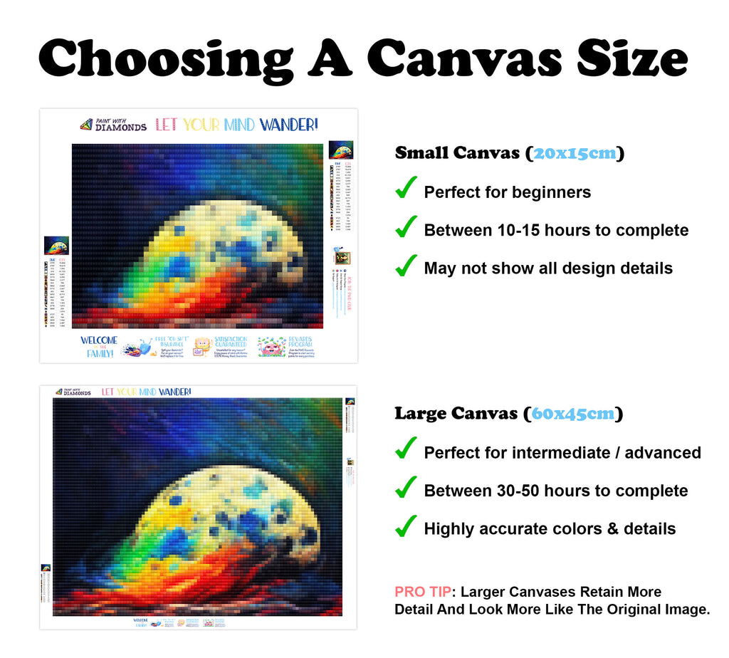Large canvases show tiny details and all lettering, but may take up to 50+ hours to complete.
