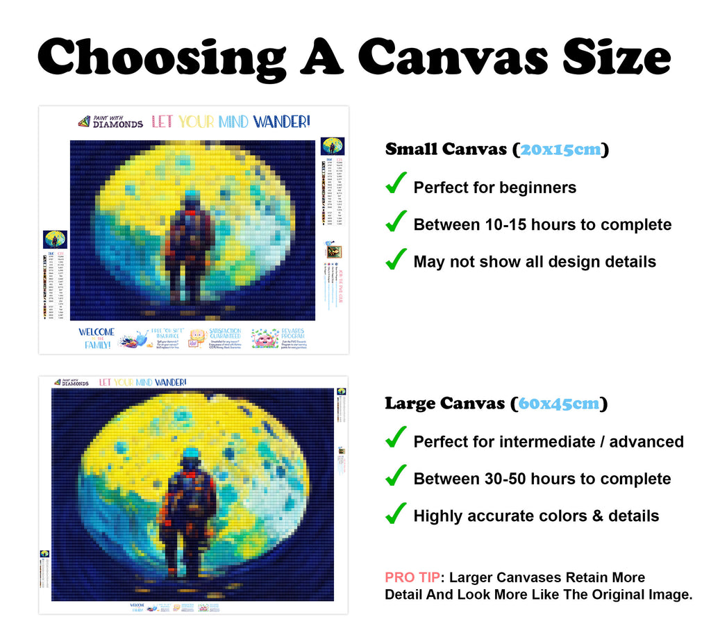 Large canvases show tiny details and all lettering, but may take up to 50+ hours to complete.
