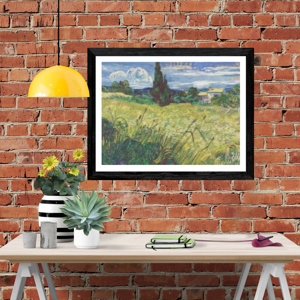 Create your own shimmering DIY wall art, one "diamond" at a time! This gorgeous full drill Diamond Painting Kit is entitled "Green Wheat Fields" and includes everything you need to get started!