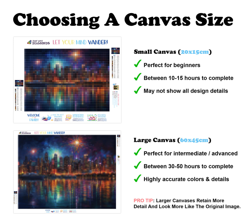 Escape into a world of vibrant colors and creative tranquility with the ‘Luminous City Nightscape’ Diamond Painting Kit. This exclusive full-drill design by artist Caleb Smith is available only at Paint With Diamonds. Let your mind unwind as you piece together shimmering diamonds to create a beautiful masterpiece.