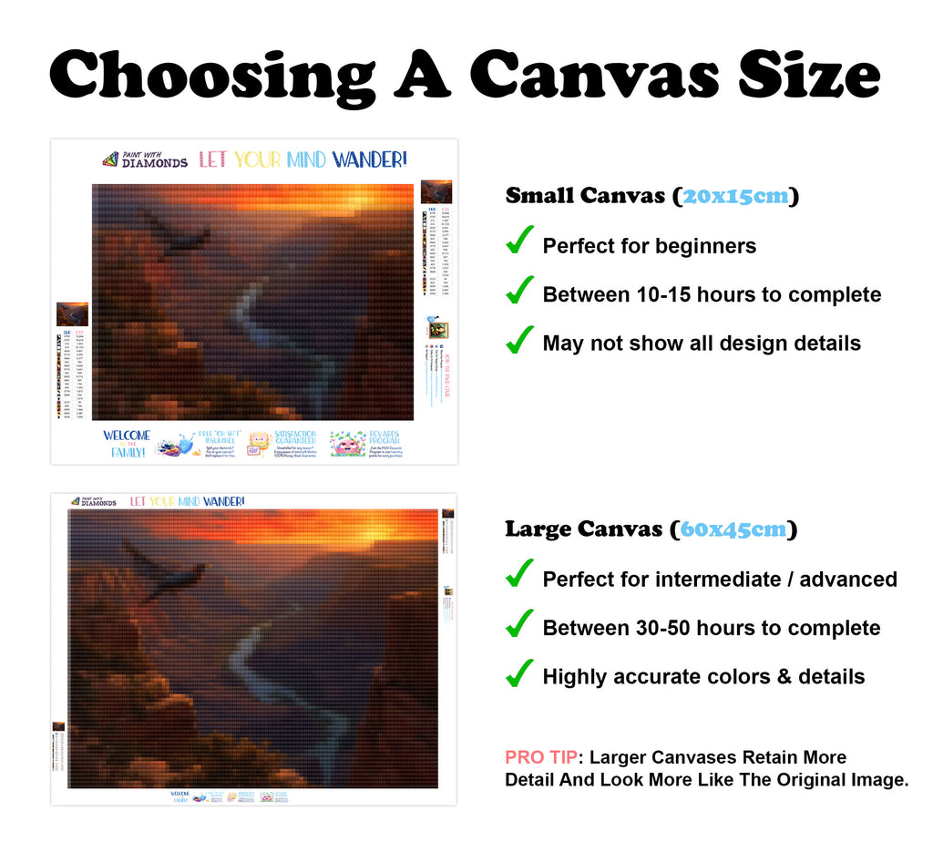 Large canvases show tiny details and all lettering, but may take up to 50+ hours to complete.