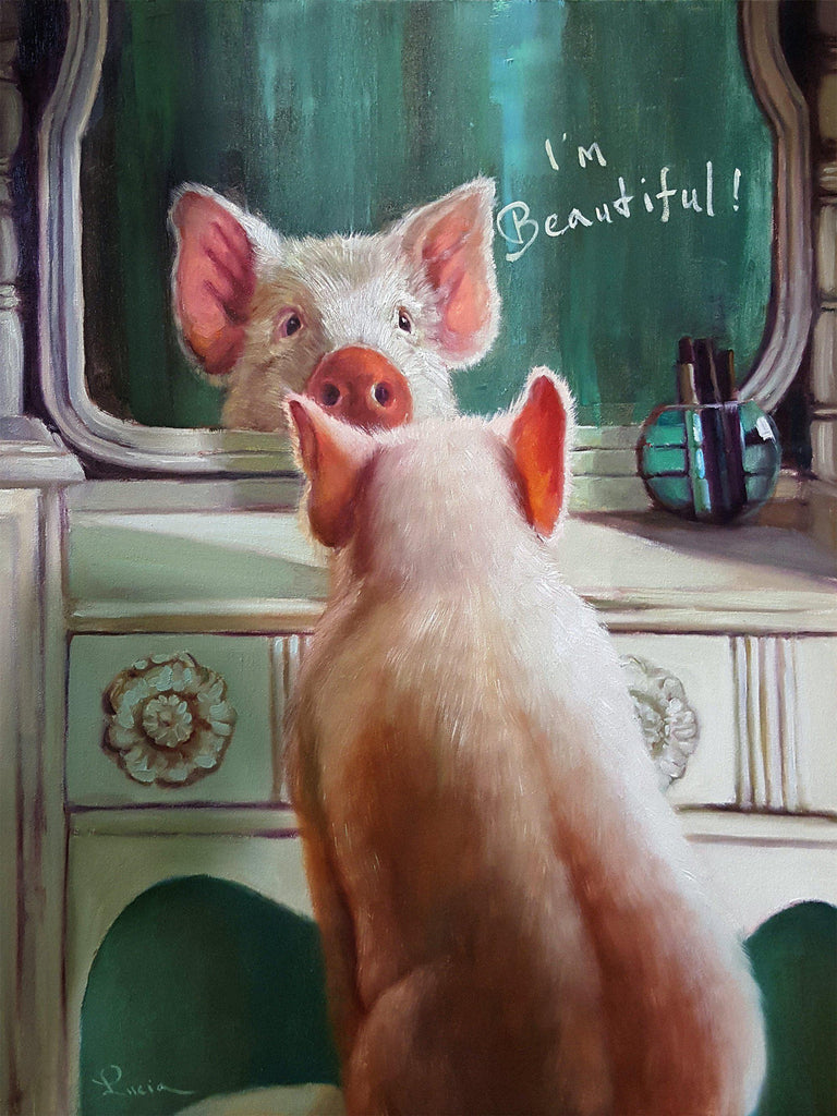 "My body of work is an expression & exploration of my fascination with animals. Through my paintings, I seek to give animals a voice and a personality, while making light of our uniquely human existence. By imagining what animals might do if put in human situations, I stage tableaus that shine a spotlight on both their innocence and raw instinct. This collision between animal and human sensibilities creates a whimsical, theatrical, and often humorous world that viewers can relate to on an emotional level."