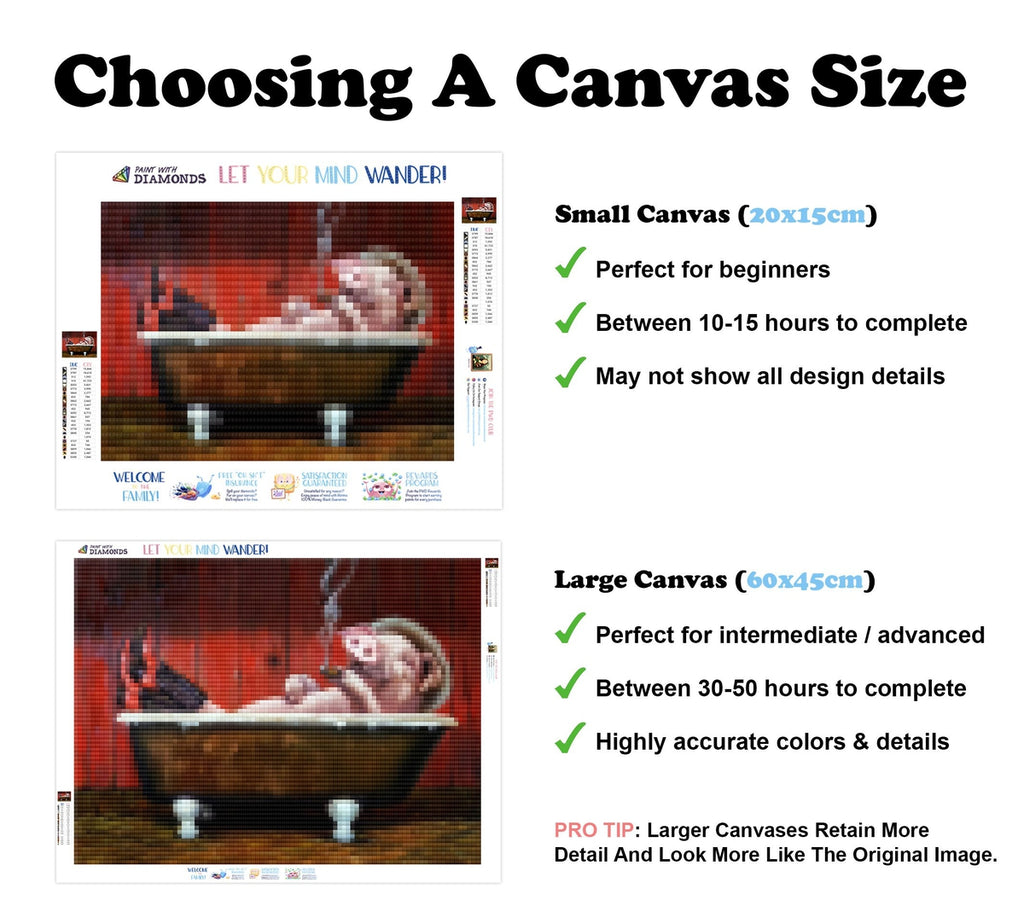 Large canvases show tiny details and all lettering, but may take up to 50+ hours to complete.