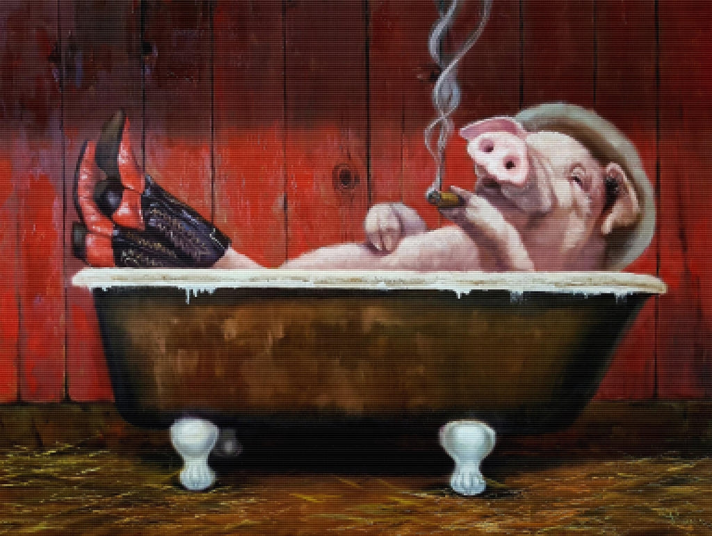 "My body of work is an expression & exploration of my fascination with animals. Through my paintings, I seek to give animals a voice and a personality, while making light of our uniquely human existence. By imagining what animals might do if put in human situations, I stage tableaus that shine a spotlight on both their innocence and raw instinct. This collision between animal and human sensibilities creates a whimsical, theatrical, and often humorous world that viewers can relate to on an emotional level."