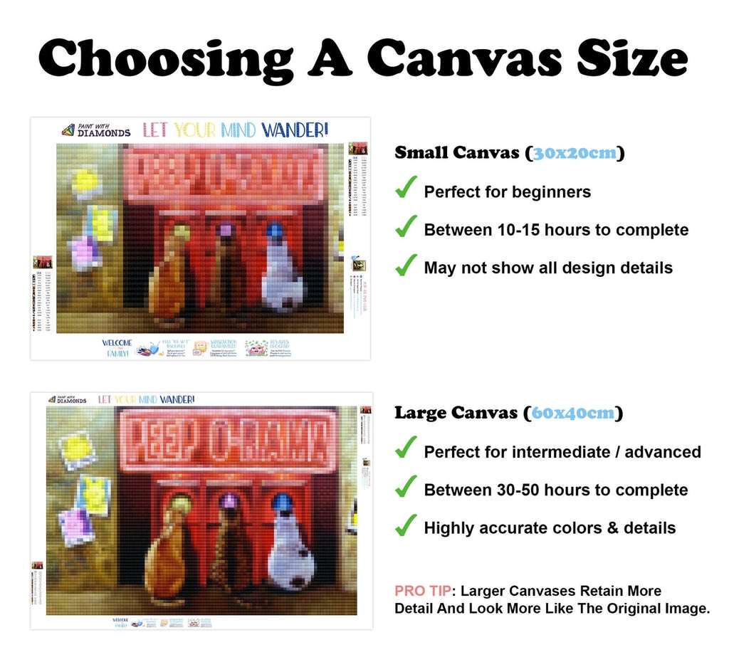Large canvases show tiny details and all lettering, but may take up to 50+ hours to complete.
