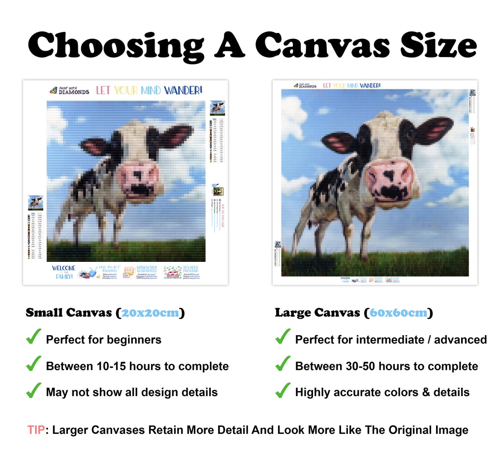 Large canvases show tiny details and all lettering, but may take up to 50+ hours to complete.