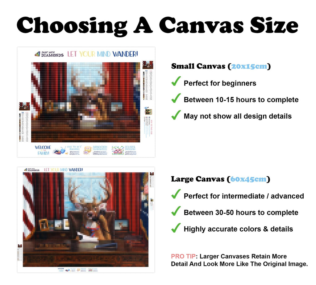 Large canvases show tiny details and all lettering, but may take up to 50+ hours to complete.