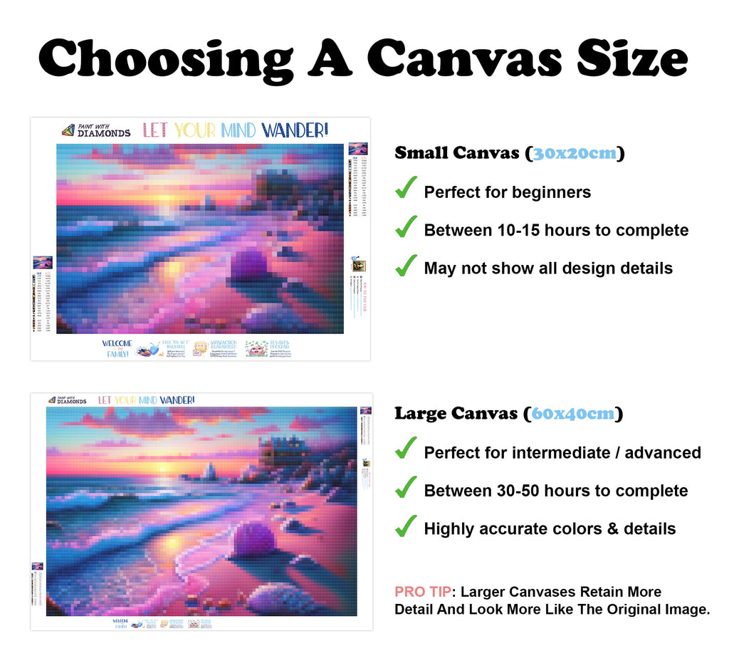 Large canvases show tiny details and all lettering, but may take up to 50+ hours to complete.