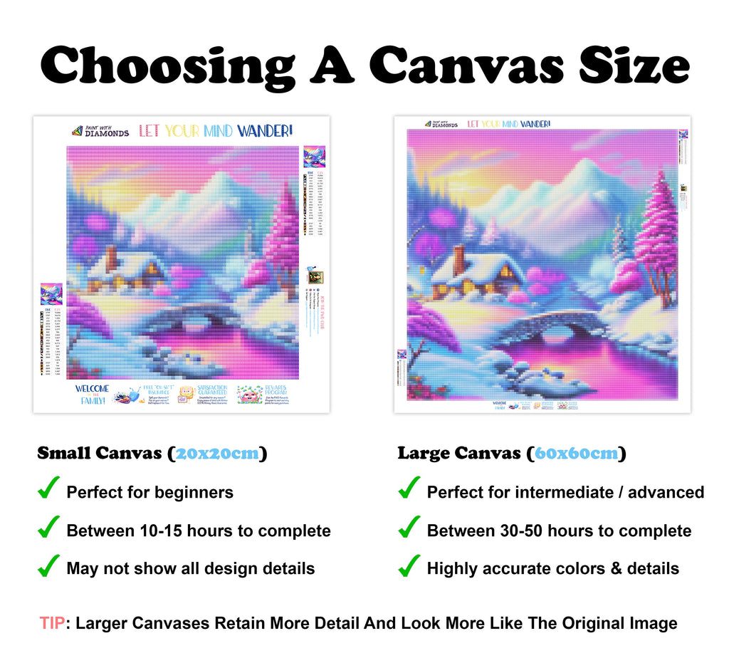 Large canvases show tiny details and all lettering, but may take up to 50+ hours to complete.