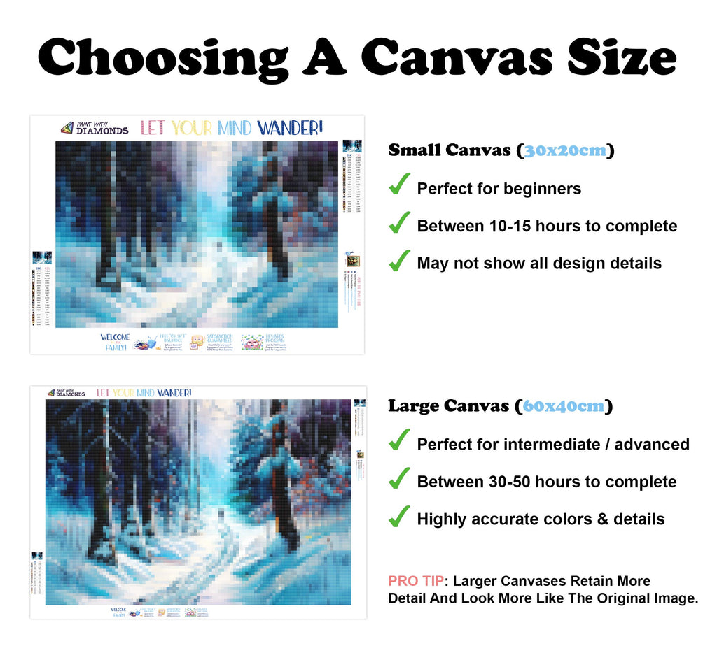 Large canvases show tiny details and all lettering, but may take up to 50+ hours to complete.