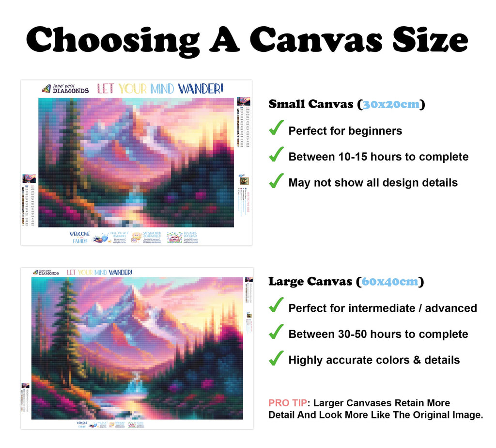 Large canvases show tiny details and all lettering, but may take up to 50+ hours to complete.