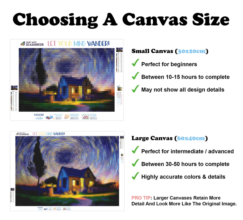Large canvases show tiny details and all lettering, but may take up to 50+ hours to complete.