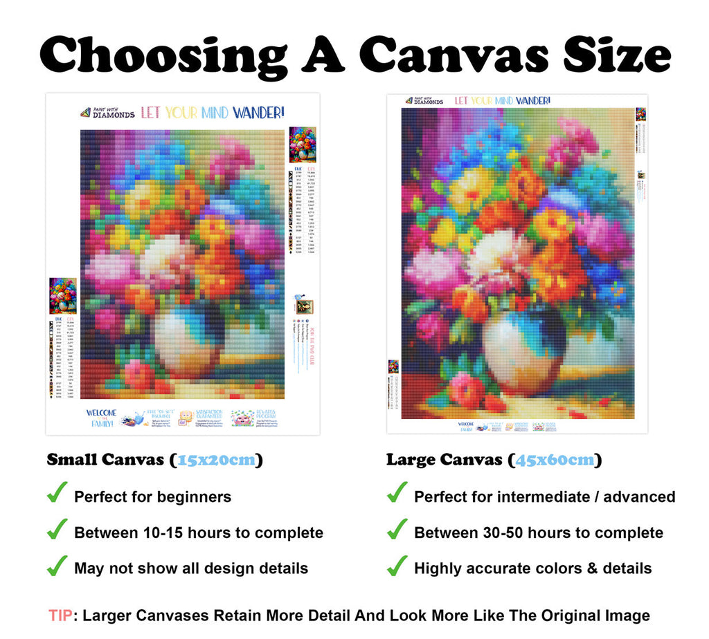Large canvases show tiny details and all lettering, but may take up to 50+ hours to complete.