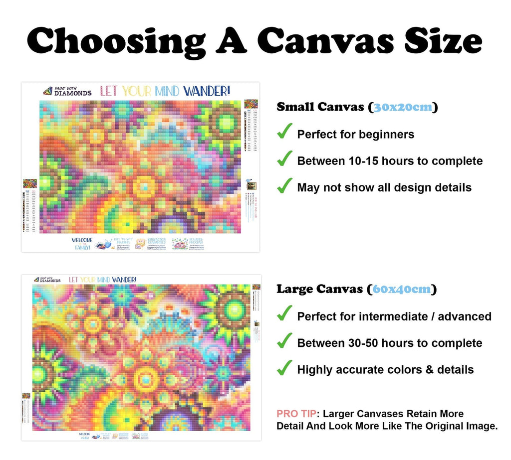 PREMIUM DIAMOND PAINTING KIT: Official Diamond Art kit includes 1x stay-flat adhesive canvas, 1x set of shimmering eco-friendly resin diamonds, and 1x premium toolkit. Diamonds cover the whole canvas.