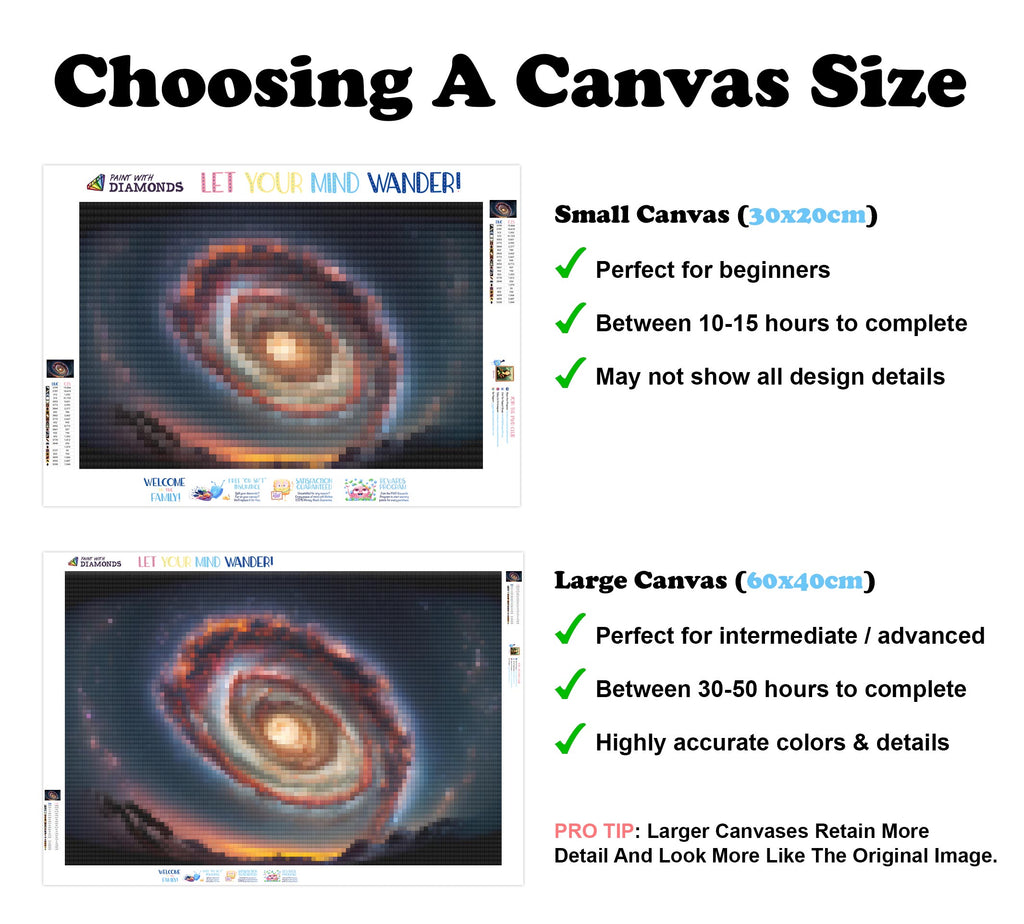 Large canvases show tiny details and all lettering, but may take up to 50+ hours to complete.