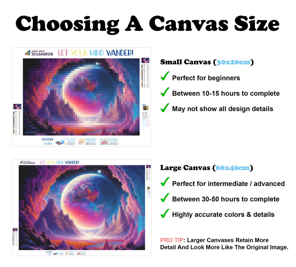 Large canvases show tiny details and all lettering, but may take up to 50+ hours to complete.