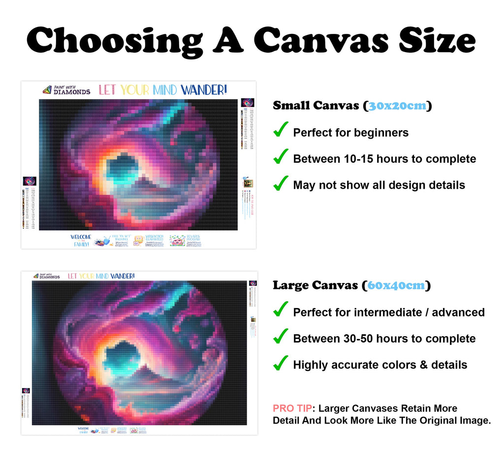 Large canvases show tiny details and all lettering, but may take up to 50+ hours to complete.